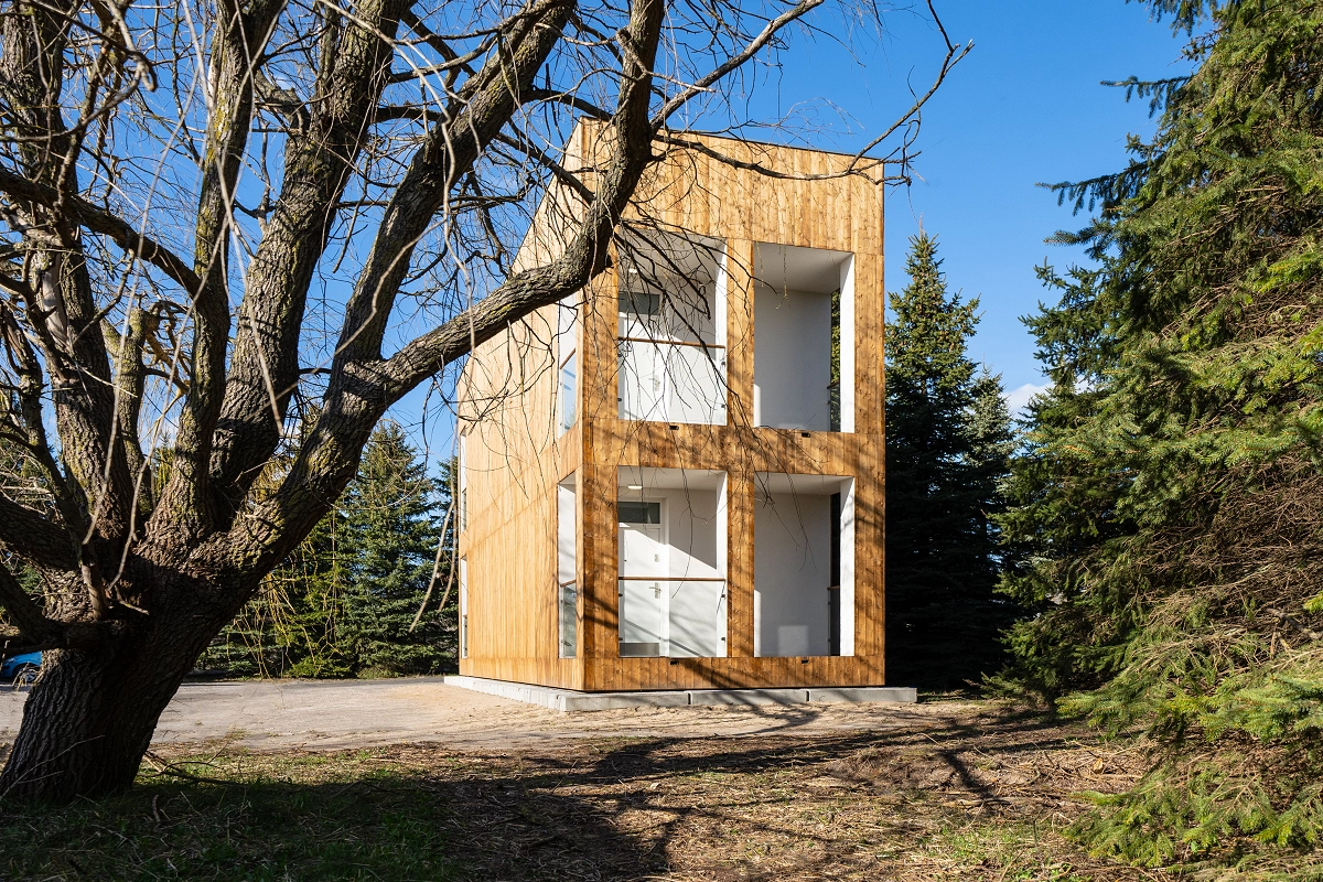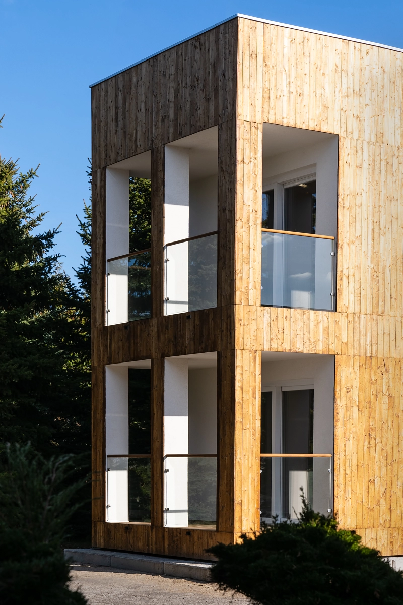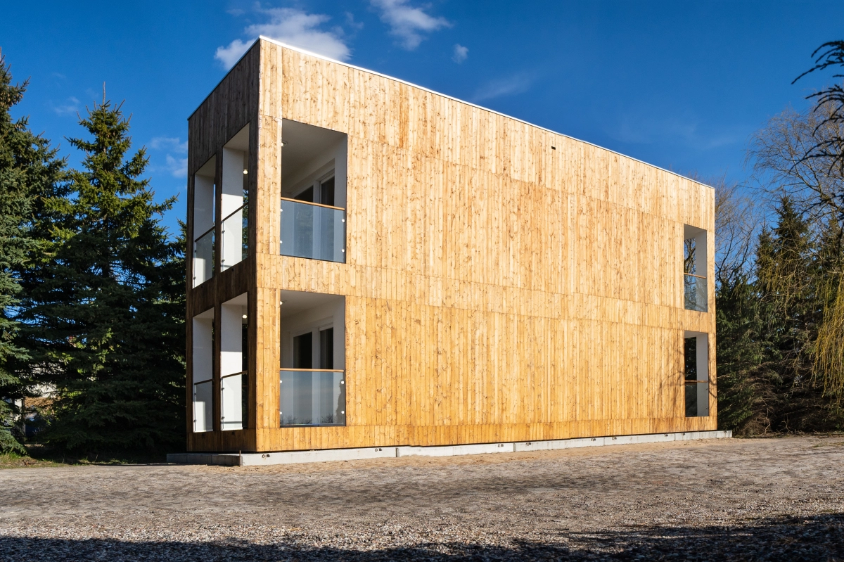 W 2022 r. w Wielkim Łęcku (woj. warmińsko-mazurskie) wybudowaliśmy dwukondygnacyjny budynek prototypowy wykonany w technologii BIOPAN components. Obejmuje on dwa pokazowe mieszkania 1-osobowe o powierzchni 30 m2 każde. Budynek został zmontowany z przygotowanych w zakładzie prefabrykacji komponentów konstrukcji głównej, ścian, stropów i stropodachów. Prace wykonane na budowie objęły hydroizolację dachu i tarasów, wykonanie elewacji wentylowanej oraz wykończenie wnętrz. Budynek prototypowy został poddany testom (badania termowizyjne, test szczelności, badania jakości powietrza wewnętrznego, badania akustyczne), które potwierdziły zalety technologii BIOPAN components. Budynek prototypowy został wybudowany tak aby możliwy był jego demontaż i ponowne wykorzystanie komponentów budowlanych w innym obiekcie.